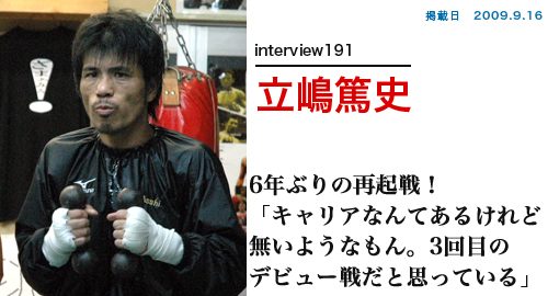 9月20日(日)東京・後楽園ホールで開催されるTITANS事務局『TITANS NEOS 6』にて、約6年ぶりの再起戦を行う立嶋。90年代、低迷していたキックボクシング界の息を吹きかえらせ、時代を作ったカリスマは37歳にして再びリングに立つ。最終調整に燃える立嶋を直撃した。