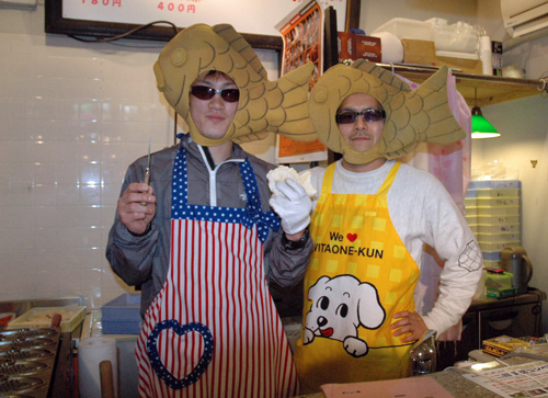 たい焼きの被り物にサングラスという制服で店長と共に店に立つDJ.taiki。「この格好で12:00から売っています。多い時で1日100個ぐらい売りますね」という。店長がDJ.taikiのコーチであり、無償で教えてもらうために今年からバイトを始めた。同コーチは元パンクラス&DEEPミドル級王者の中西裕一のコーチでもあった。