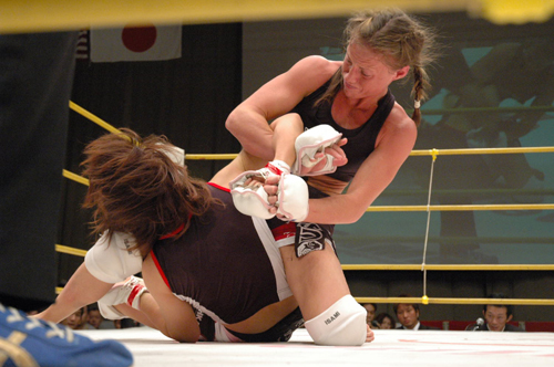 寝技ルール30秒以内に仕留めきれず、スタンドから再開。パンチ連打でコーナーに追い込んだ瀧本はバックを取ったのだが、リサは瀧本の腕をがっちりホールド。そのままアームロックで絞り上げ、あっという間にタップを奪った。