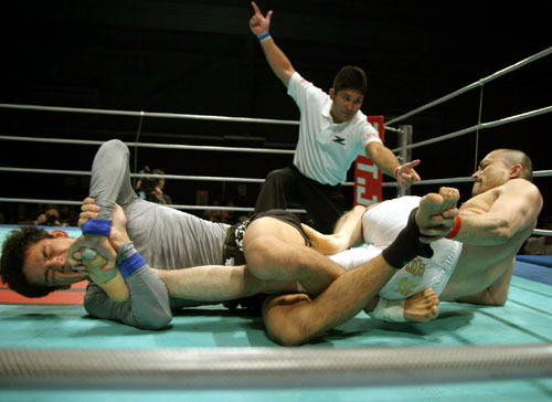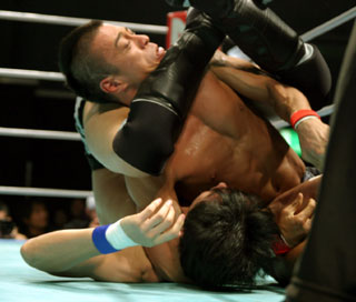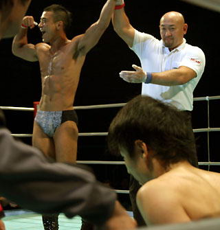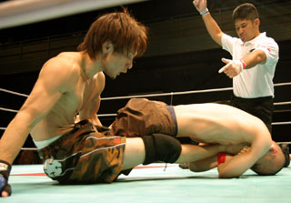 一旦はガードに戻されたものの、間髪入れずにヒールホールド! 残り時間は少なかったものの、一気に川頭の足を絞り上げタップを奪った。