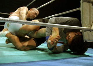 スタンドに戻り自ら引き込んだ横山は矢野の足を取って足関節を狙い。互いにゴロゴロと回転するなか、横山がアンクルホールドで矢野の足首を絞り上げる。