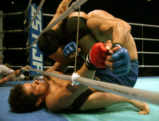 金原はそれを腕でブロックして、下から顔面を蹴り上げ。さらにイノキ・アリ状態から足を絡めてポジションを入れ替えると、一気にマウントポジションへ。