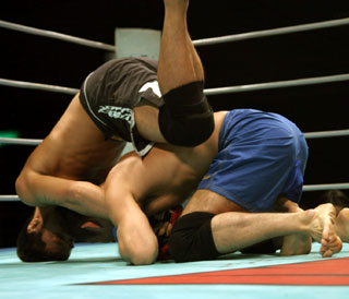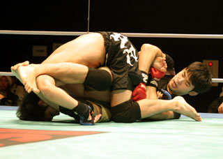 再開後、タックルで川頭をコーナーに押し込む梅木は、サイドポジションからアームロック狙い。再びマウントポジションを奪い、ここから変形のチョークを狙う。するとここで川頭がロープエスケープ。