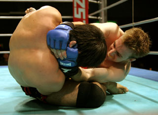 細かくボディにパンチを落としながら、竹田が上四方からマウントへ。そして腕十字を狙っていくが、内村も必死に腕をクラッチし体をずらして逃げる。