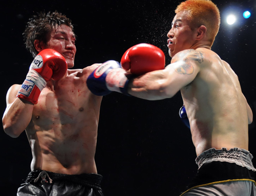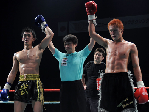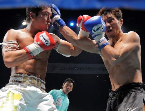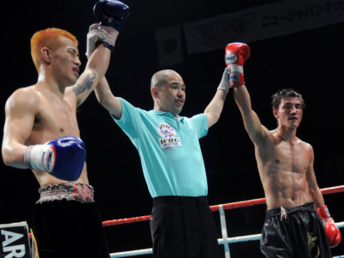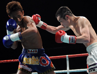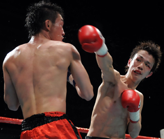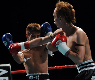 下がる太陽はカウンターの右、組んでのヒザ蹴り。両者攻めに攻めた5Rが終了した。 判定はジャッジ1名が太陽に1ポイント差をつけたが、残り2名がドロー。熱戦は文字通りの痛み分けに終わった。