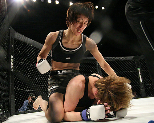 ▼第5試合 女子フライ級(45.4kg)初代チャンピオン決定トーナメント 準決勝 3分3R ○玉田育子(AACC) 判定3−0 ●ハッピー福子(総合格闘技コブラ会) 1R、玉田はすぐにハッピーに組み付いてテイクダウンを奪う。ここから玉田はポジショニングでハッピーを圧倒し、バックポジションをキープする。ハッピーは必死にチョークや腕十字をディフェンスし、この状態のままで1Rが終了となる。
