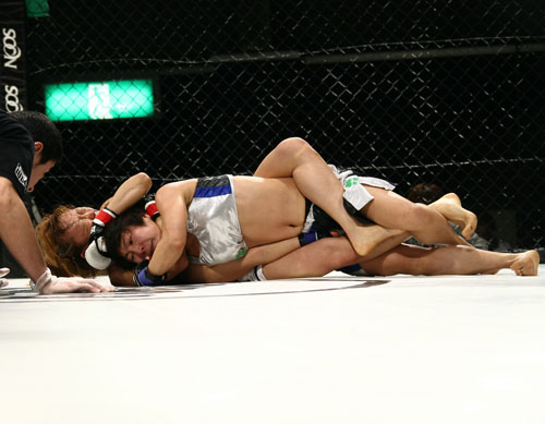 細かくパンチを打ち込んでいく藪下、ポジションを変えるところで葛西が立ち上がるが、すぐに組み付いて再び首投げでテイクダウン。同じく袈裟固めからパンチを見舞う。パウンドを叩き込み、腕十字に行く藪下。葛西が上になってパウンドを連打したところで初回が終了した。