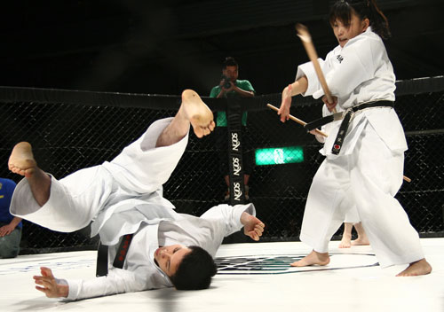 最初にグレイシー柔術のセルフディフェンステクニックの演武が行われた。まず一般会員2名が暴漢に襲われた場合のセルフディフェンステクニックを披露し、続いて「V一が押し倒された場合」「V一がナイフで襲われた場合」「V一が夜道で背後から抱きつかれた場合」などのシチュエーションで、飛びヒザ蹴りやマウントパンチなど派手な技を連発して場内を沸かせる。