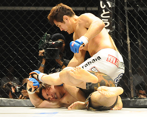 1R、三島は左のパンチから飛び込むとハーフからパウンドを連打。しかし山崎は何度かのトライの後、立ち上がることに成功する。が、三島はすぐに下から三角の体勢に。