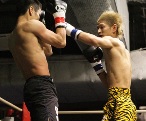 ▲スーパーフェザー級新人王の家元(右)がランカーのTASUKUに競り勝つ