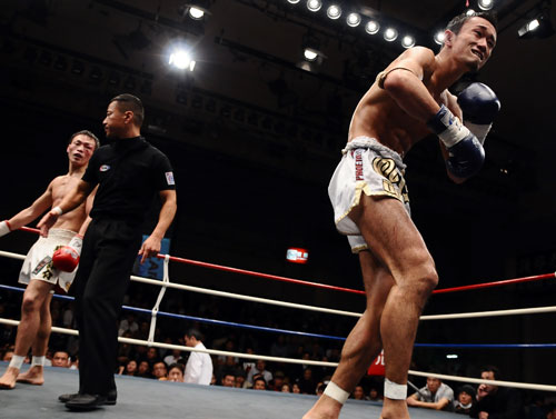 2R、渡部は右へ回り込みながら左ミドルを多用し、T-98は追い詰めていって首相撲からのヒザ。しかし、ここで渡部のヒジが鈍い音を立てて炸裂! T-98は流血してドクターチェックが入る。