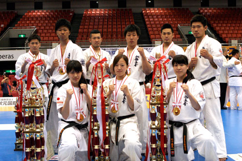 男子軽量級は4連覇が期待されていた日本軽量級の絶対王者・前田優輝が欠場するという波乱が起こり、他流派・白蓮会館の福地勇人(右写真、左から2人目)が優勝するという大波乱となった。