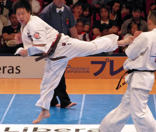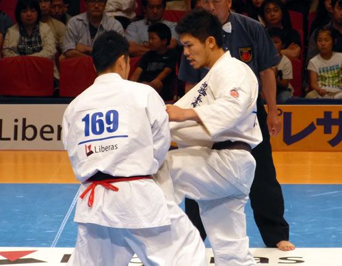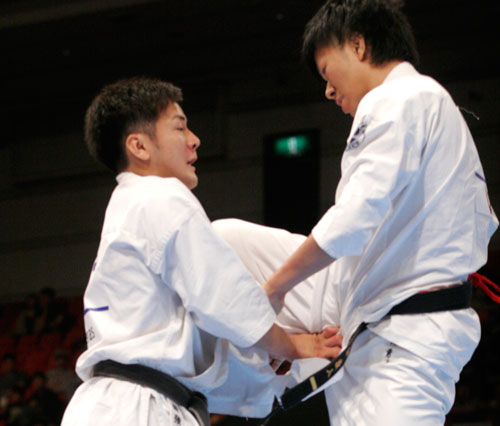 ▲他流派の福地(右)が上段膝蹴りで技ありを奪い、初優勝を果たした